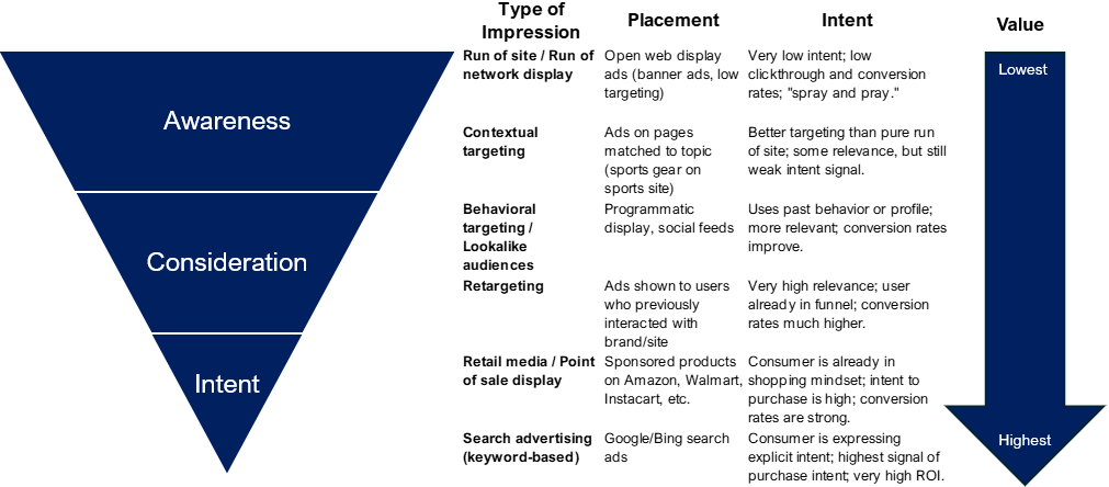 It follows that the value and pricing of different types of impressions depends on the expected likelihood of conversion. A helpful framework for thinking about this is the advertising “funnel.” There are a few versions of advertising or marketing funnels, but the basic concept is that the top of funnel is awareness, the middle is consideration, and the bottom is intent (Figure 2).