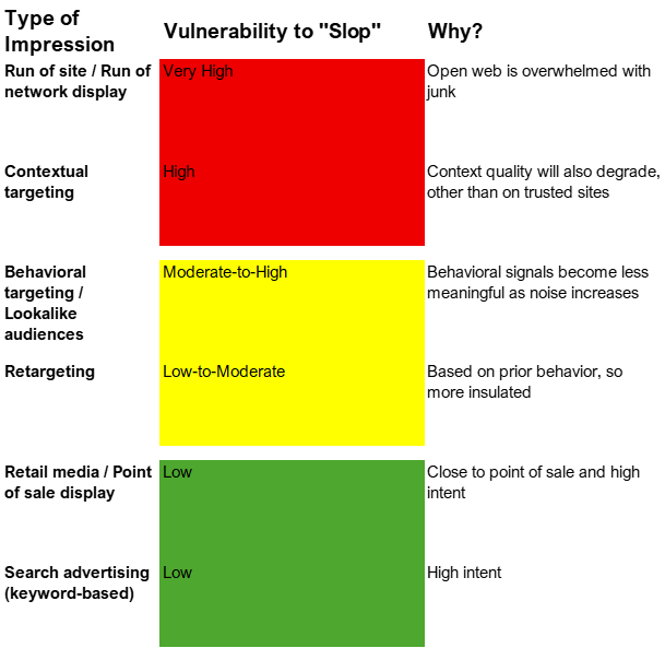 As shown in Figure 3, a vast increase in content supply will probably further devalue programmatic advertising on the open web. It may also pressure contextual advertising, especially on unknown sites, because brands will be more concerned about content quality and brand safety. It will likely weigh on the value of some behavioral targeting, since the behavioral inputs may become less meaningful as AI noise pollutes the signal. Retargeting should be more insulated, since these users will have engaged in a specific behavior. Retail media and search will probably retain value or become relatively more valuable, since they enable advertisers to reach consumers who are not just passively consuming, but have high intent.
