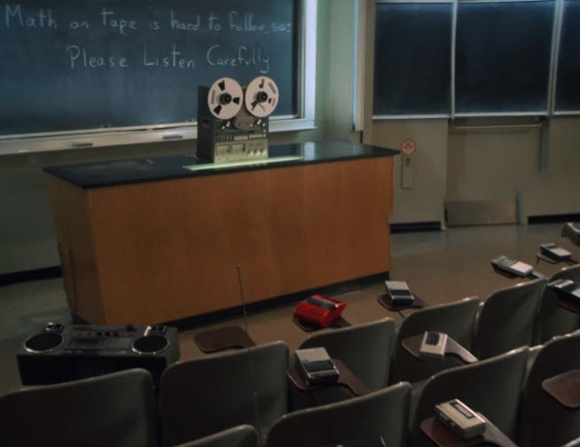 There’s a running gag in 1985 movie Real Genius, starring Val Kilmer as a wisecracking college student. The film occasionally cuts to an impossibly boring science class. Over the semester, one-by-one, the students gradually replace themselves with tape recorders, left on their desks to record the lecture. By the end of the term, the entire class is full of tape recorders, including the professor. One machine gives the lecture to the other machines.